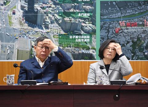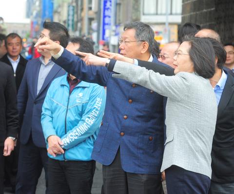 At about 2pm yesterday, Tsai and Ko met at the plaza of the historic North Gate (北門) in Taipei, where Taipei Deputy Mayor Charles Lin (林欽榮) briefed the president on improvements made to the surrounding area before the group went into the adjacent Taipei Post Office for further discussions.