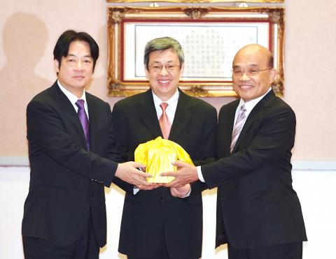 Su later went to the Executive Yuan complex and received the seal of office from his predecessor, William Lai (賴清德), who led his Cabinet in resigning en masse on Friday last week to take responsibility for the Democratic Progressive Party’s (DPP) losses in the local elections in November last year.