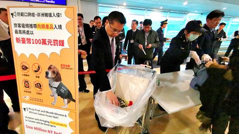 Minister of the Interior Hsu Kuo-yung (徐國勇) yesterday visited the airport to oversee inspections and assisted inspectors by asking tourists to take any meat products out of their carry-on luggage and dispose of them in trash containers.