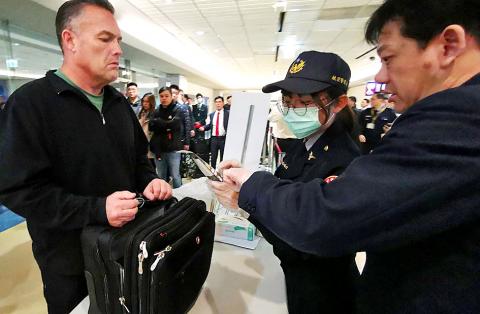 Taiwan Taoyuan International Airport customs officers yesterday expanded inspections of carry-on luggage for passengers from China, Macau and Hong Kong — which are at high risk for African swine fever — but a lack of personnel and X-ray machines resulted in long lines of arriving passengers.