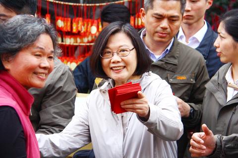 Tsai was accompanied on her visit by Democratic Progressive Party (DPP) Chairman Cho Jung-tai (卓榮泰) and Minister of the Interior Hsu Kuo-yung (徐國勇), the first stop of her four-day-long temple visits to distribute red envelopes with NT$1 inside, which symbolizes a new beginning.