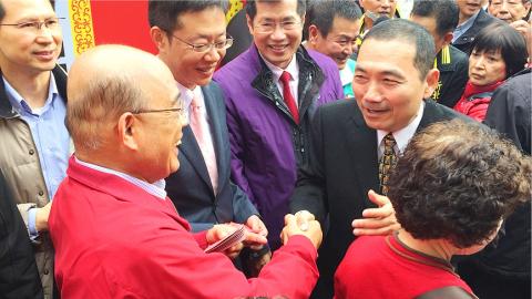 Su exchanged friendly greetings with New Taipei City Mayor Hou You-yi (侯友宜) when they ran into each other at the Jieyun Temple (接雲寺).