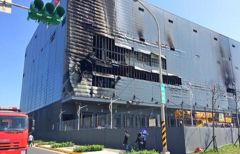 Authorities said they received reports of a fire at a warehouse of Kerry TJ Logistics of Taiwan (嘉里大榮物流) at about 10am on Wednesday.