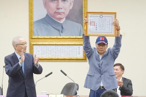 In the afternoon, Gou attended a ceremony at which KMT Chairman Wu Den-yih (吳敦義) gave him a Central Standing Committee “honorary certificate,” while referring to him as a “comrade” and “fellow party member.”
