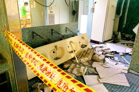 Metal ceiling frames fell and some sinks collapsed in the men’s dorm at National Taiwan Normal University in Taipei, while ceilings broke in National Luodong Vocational High School in Yilan County and Buxin Elementary School in Chiayi County, it said.