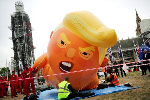 Leaders of Britain’s main opposition party were to join demonstrators at a rally in Trafalgar Square, just up the street from May’s Downing Street office. Also in Trafalgar Square, a 3m robotic likeness of Trump sat on a golden toilet.