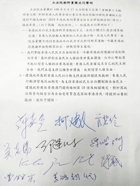 Legislators also called on President Tsai Ing-wen’s (蔡英文) administration to offer support to Hong Kong protesters on the basis of the Act Governing Relations with Hong Kong and Macau (香港澳門關係條例).