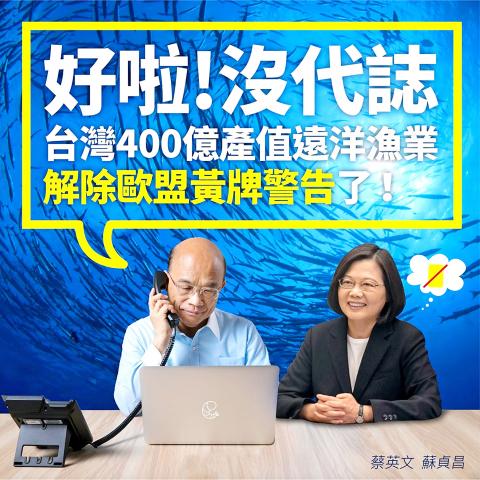“We have succeeded in protecting seafood exports, which have an annual worth of more than NT$40 billion [US$1.29 billion],” Tsai wrote on Facebook.