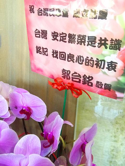 Hon Hai Precision Industry Co (鴻海精密) founder Terry Gou (郭台銘) and Chinese Nationalist Party (KMT) Legislator Wang Jin-pyng (王金平) sent flowers to congratulate the party on its founding.