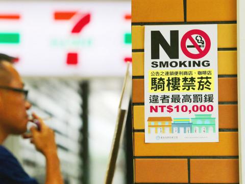 Under current regulations, there are few outdoor spaces where smoking is banned, Department of Health Commissioner Huang Shier-chieg (黃世傑) said, adding that these do not include roofed sidewalks, pedestrian arcades and often-crowded public spaces.