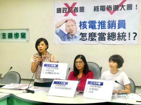 DPP Legislator Kuan Bi-ling (管碧玲) said that she was frightened by Han’s promise to restart work at the mothballed Fourth Nuclear Power Plant and the shortsightedness of former premier Simon Chang (張善政), who is head of Han’s advisory team.