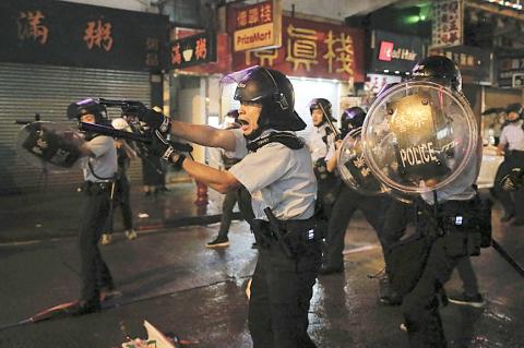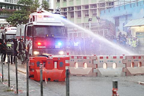 Police in Hong Kong yesterday used tear gas to clear pro-democracy demonstrators who had taken over a street and brought out water cannon trucks for the first time in the summer-long protests.
