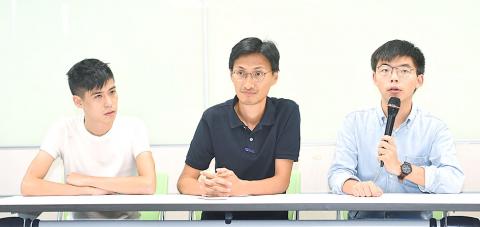 Hong Kong democracy activists Joshua Wong (黃之鋒), Lester Shum (岑敖暉) and Eddie Chu (朱凱迪) yesterday called on Taiwanese to support the territory’s fight for greater democracy and autonomy by holding a rally before China’s National Day on Oct. 1.