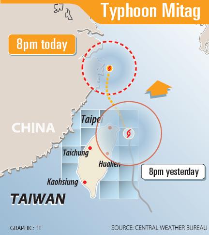 As of 8:30pm yesterday, Mitag was about 110km southeast of the coast of Yilan County, with its radius covering the nation’s eastern and southeastern land mass.