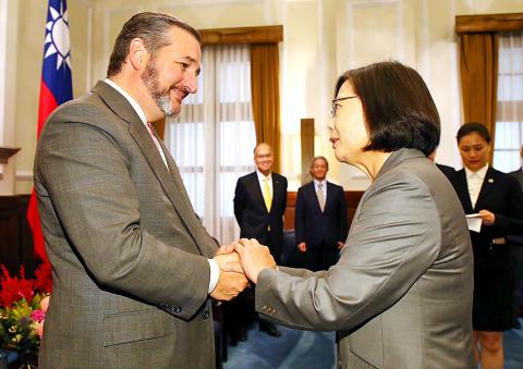 Tsai expressed her deepest gratitude to Cruz for having supported every Taiwan-friendly bill passed by the US Senate, including the National Defense Authorization Act, which reasserted that the Taiwan Reassurance Act and the “six assurances” are the cornerstone of exchanges between Taiwan and the US.