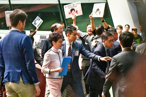 Calling her “the mother of the mafia police,” pro-democracy lawmakers yesterday twice forced Hong Kong Chief Executive Carrie Lam (林鄭月娥) to stop delivering a speech laying out her policy objectives and then clamored for her resignation in chaotic scenes that caused her to walk out of the Legislative Council.