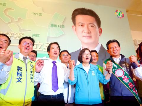 Tsai and Lai arrived together to stump for DPP Legislator Lin Chun-hsien (林俊憲), who has set up a campaign office in the city deemed to be a solid base of support for the party.