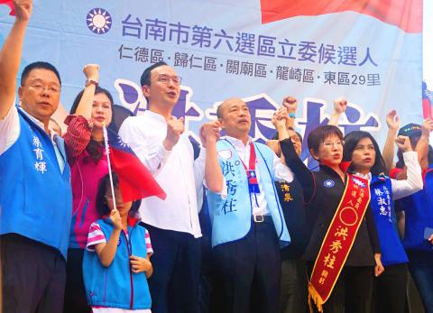 At the Chinese Nationalist Party (KMT) event, Kaohsiung Mayor Han Kuo-yu (韓國瑜), the KMT’s presidential candidate, stumped for one of the party’s Tainan legislative candidates, former KMT chairwoman Hung Hsiu-chu (洪秀柱), who opened her campaign office in the city.