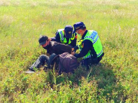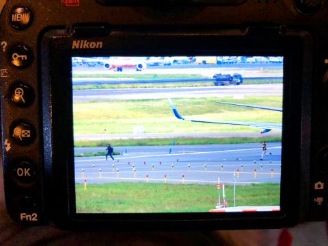 The man entered the restricted zone around the airport and ran toward China Airlines (中華航空) Flight CI28, which was on a runway waiting to take off, before attempting to climb its landing gear, police said.