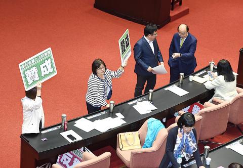 Ker’s motion was voted down by other caucus members, as well as the three remaining New Power Party legislators — Huang Kuo-chang (黃國昌), Hsu Yung-ming (徐永明) and Jang Show-ling (鄭秀玲) — who apparently vetoed the motion to show support for the bill.