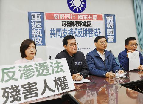 At a news conference at the Legislative Yuan, the KMT caucus — which had unanimously boycotted the legislative meeting — unveiled a bill against annexing the Republic of China (ROC), which it said was meant to replace the anti-infiltration bill.