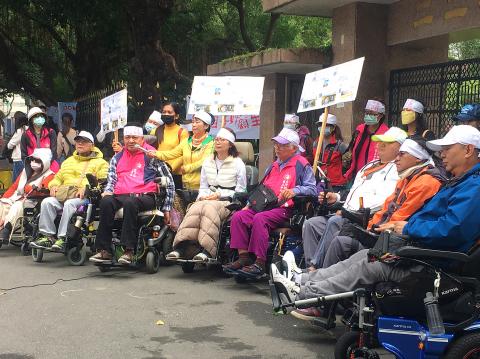 Members of the association and the Association of Spinal Cord Injury Taipei, as well as 10 people in wheelchairs, rallied at Taipei’s 228 Peace Memorial Park (228和平紀念公園) calling for the right to receive better care services and to be treated with respect and dignity.