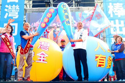 In Kaohsiung, Han told a rally with the KMT’s local legislative candidates that he would take better care of the public if elected president, and that he has been working very hard toward the goal of creating a better future for younger generations.