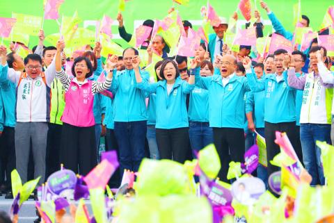 President Tsai Ing-wen (蔡英文) and her main challenger, Kaohsiung Mayor Han Kuo-yu (韓國瑜) of the Chinese Nationalist Party (KMT), were out on the campaign trail yesterday, with Tsai rallying the Democratic Progressive Party (DPP) faithful and others in New Taipei City, while Han made appeals to his city’s residents.