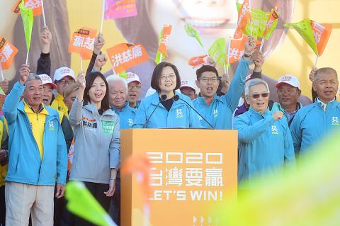 President Tsai Ing-wen (蔡英文) yesterday urged voters to re-elect her, saying that the Jan. 11 elections are pivotal, because “the whole world is watching Taiwan” due to the protests in Hong Kong.