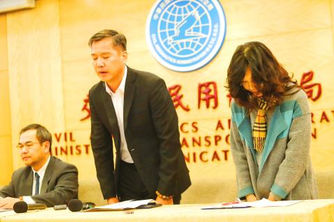 At a news conference at CAA headquarters in Taipei yesterday, FAT vice presidents Huang Yu-chi (黃育祺) and Lu Chi-rong (盧紀融) bowed and apologized to the public for any inconvenience.