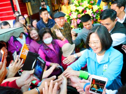 President Tsai Ing-wen’s (蔡英文) campaign schedule yesterday took her to central Taiwan, where she stumped for Democratic Progressive Party (DPP) legislative candidates while calling on voters to “support the DPP one more time” in Jan. 11’s presidential and legislative elections.