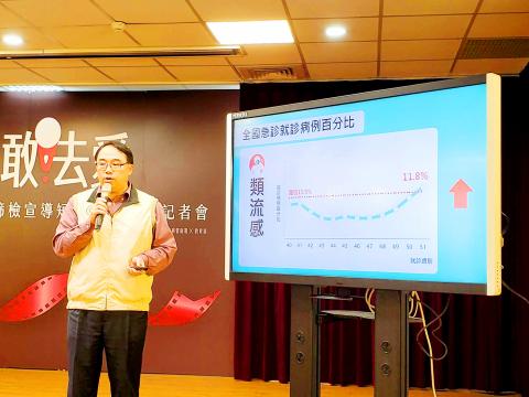 A total of 100,442 hospital visits for flu-like illness were reported last week — up 7.6 percent from a week earlier — of which 11.8 percent were emergency-room visits, surpassing the epidemic threshold of 11.5 percent, CDC Intelligence Center Deputy Director Guo Hung-wei (郭宏偉) said.