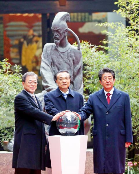 South Korean President Moon Jae-in told Japanese Prime Minister Shinzo Abe that cooperation was crucial in the face of regional security threats as the two began their 45-minute meeting on the sidelines of a trilateral summit hosted by Chinese Premier Li Keqiang (李克強) in Chengdu, China.