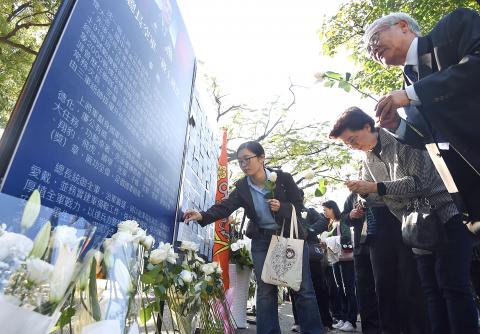 Separately yesterday, a ceremony was held at Wei-Shui’s Hill (渭水之丘) in Yilan County, followed by a rite to comfort the spirits of the deceased, which was attended by more than 1,000 people.