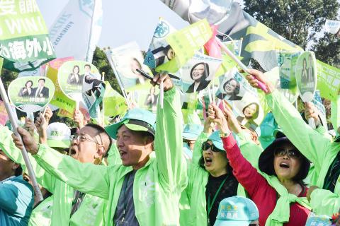Tsai later shared the stage with former premier William Lai (賴清德), her running mate, and six DPP legislative candidates at a rally in Tainan to boost morale in the party ranks.