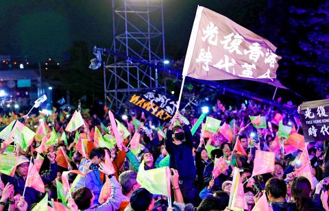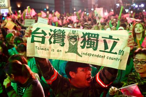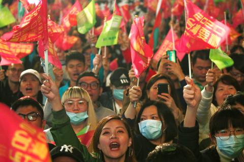 As TV channels started to broadcast results of the election, people started to gather in front of DPP headquarters in Taipei, cheering and waving flags in support of Tsai and her running mate, former premier William Lai (賴清德).