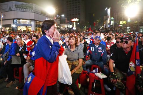 Outside the KMT’s Kaohsiung chapter, the party had set up a large screen on Jianguo Road for about 1,000 supporters who had gathered to watch the vote count.