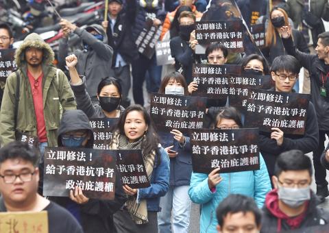About 100 people marched in Taipei yesterday, demanding that the government amend the law to ensure the rights and well-being of pro-democracy Hong Kong protesters if they come to Taiwan.