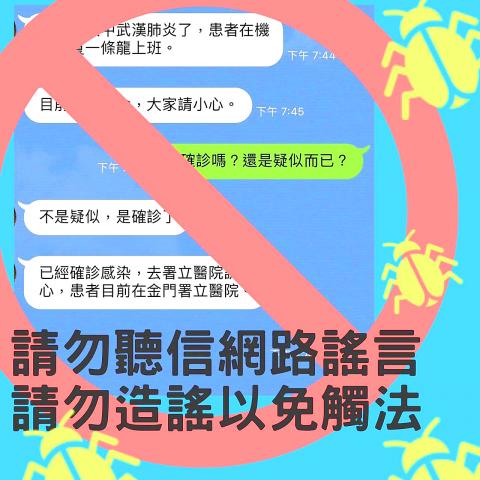These people could have contravened the Communicable Disease Control Act (傳染病防治法), Article 63 of which stipulates that “persons who disseminate rumors or incorrect information concerning epidemic conditions of communicable diseases, resulting in damages to the public or others, shall be fined up to NT$3 million.”