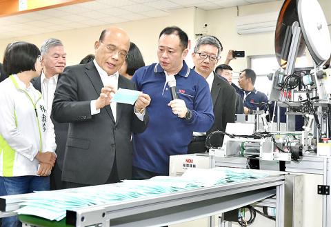Su made the remarks while inspecting mask manufacturing facilities at Nonwoven Converting Machinery Co (權和機械) in New Taipei City.