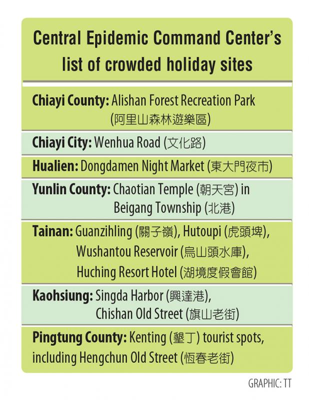 However, by “crowded places or activities” the center was not just referring to the 11 tourist spots that it listed in text messages on Saturday reminding the public to avoid crowded places and keep a proper social distance, Chen said.