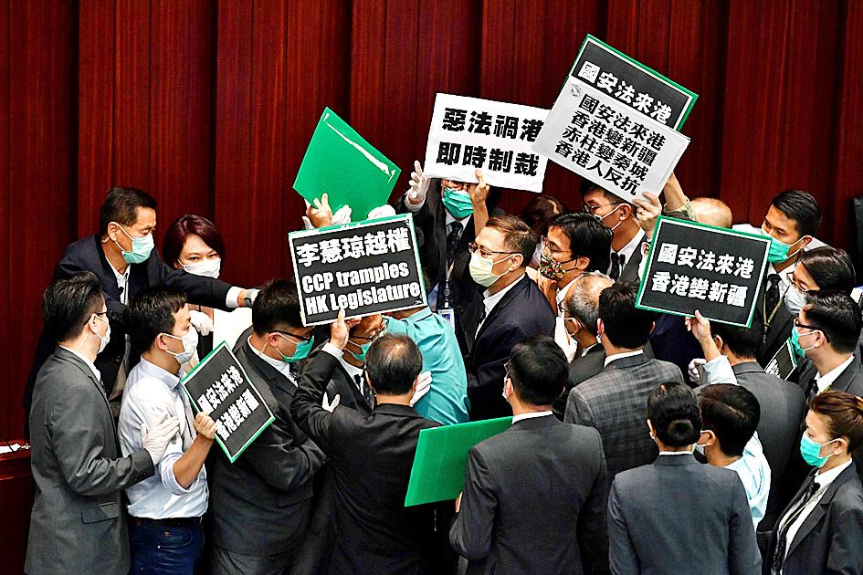 “This is the largest nuclear weapon the Chinese Communist Party has used in its mutual destruction of Hong Kong,” said Jimmy Sham (岑子杰), convener of the Civil Human Rights Front, which organized the rally that started last year’s unrest.