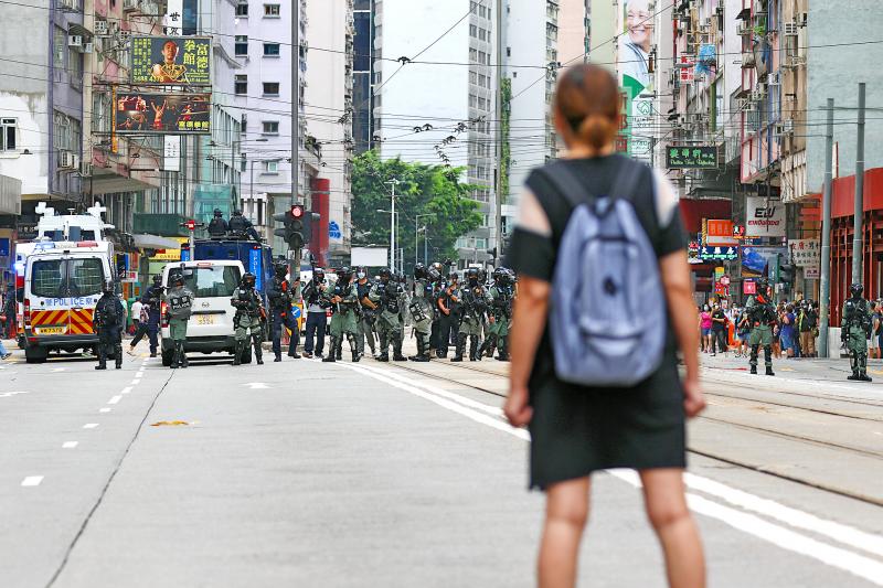 Hong Kong protesters yesterday battled with riot police in busy downtown areas, showing their opposition toward China’s dramatic move to crack down on dissent in the biggest demonstration since the coronavirus swept through the territory in January.