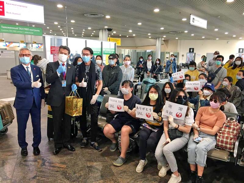 Ninety-four Taiwanese exchange students and expats, as well as two Russian spouses, arrived at Narita International Airport in Japan yesterday morning on a charter flight operated by Japan Airlines, before taking a transfer flight to Taiwan Taoyuan International Airport last night, ministry spokeswoman Joanne Ou (歐江安) said.