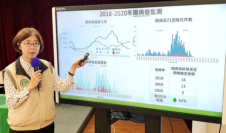 Taiwan regularly enters the peak season of enterovirus infections in May or June, with weekly reported cases exceeding the epidemic threshold (11,000 hospital visits in a week) in week 22 last year, while there were only 1,360 hospital visits last week (week 23), she said.