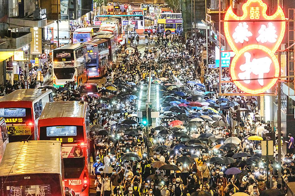 Several thousand demonstrators marched in Hong Kong yesterday evening — defying authorities a year after huge pro-democracy protests erupted — as the movement struggles in the face of arrests, COVID-19 bans on crowds and looming national security legislation.