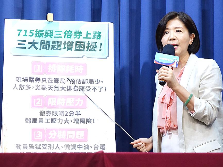 KMT Culture and Communications Committee chairwoman Alicia Wang (王育敏) said that the central government should stagger the distribution of the vouchers to avoid long lines in the summer heat.
