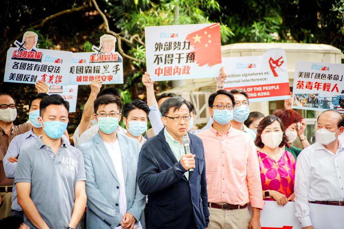 Dozens of pro-Beijing advocates and lawmakers protested outside the US consulate in Hong Kong to demand that the US stop meddling.
