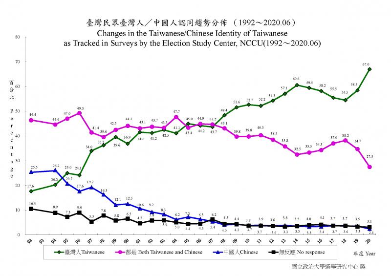 The center has been conducting the survey once or twice a year since June 1992, and uses the data to study trends in the self-identity of Taiwanese, it said.