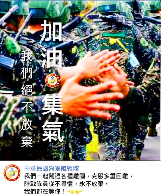 The marines — surnamed Tsai (蔡), 26, and a sergeant surnamed Chen (陳), 36 — were in a seven-member Marine Corps team that encountered rough seas during a simulated response to enemy forces landing on Taiwan. Their rubber craft overturned in waters off Taoziyuan (桃子園) beach in Zuoying District (左營), injuring four of the marines.